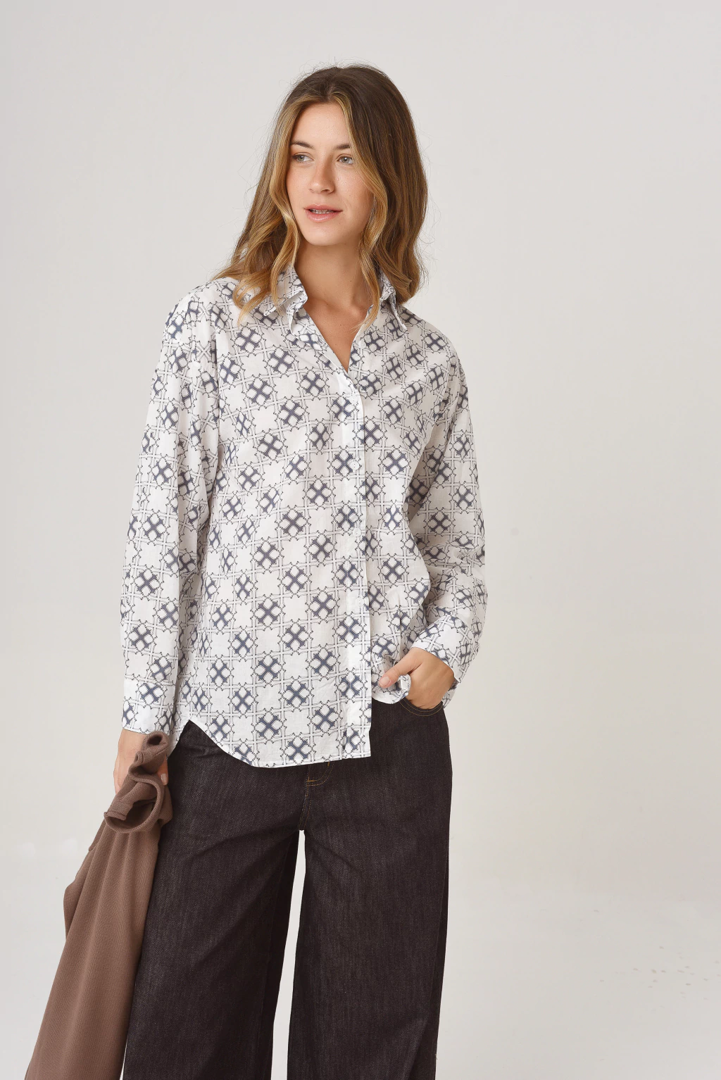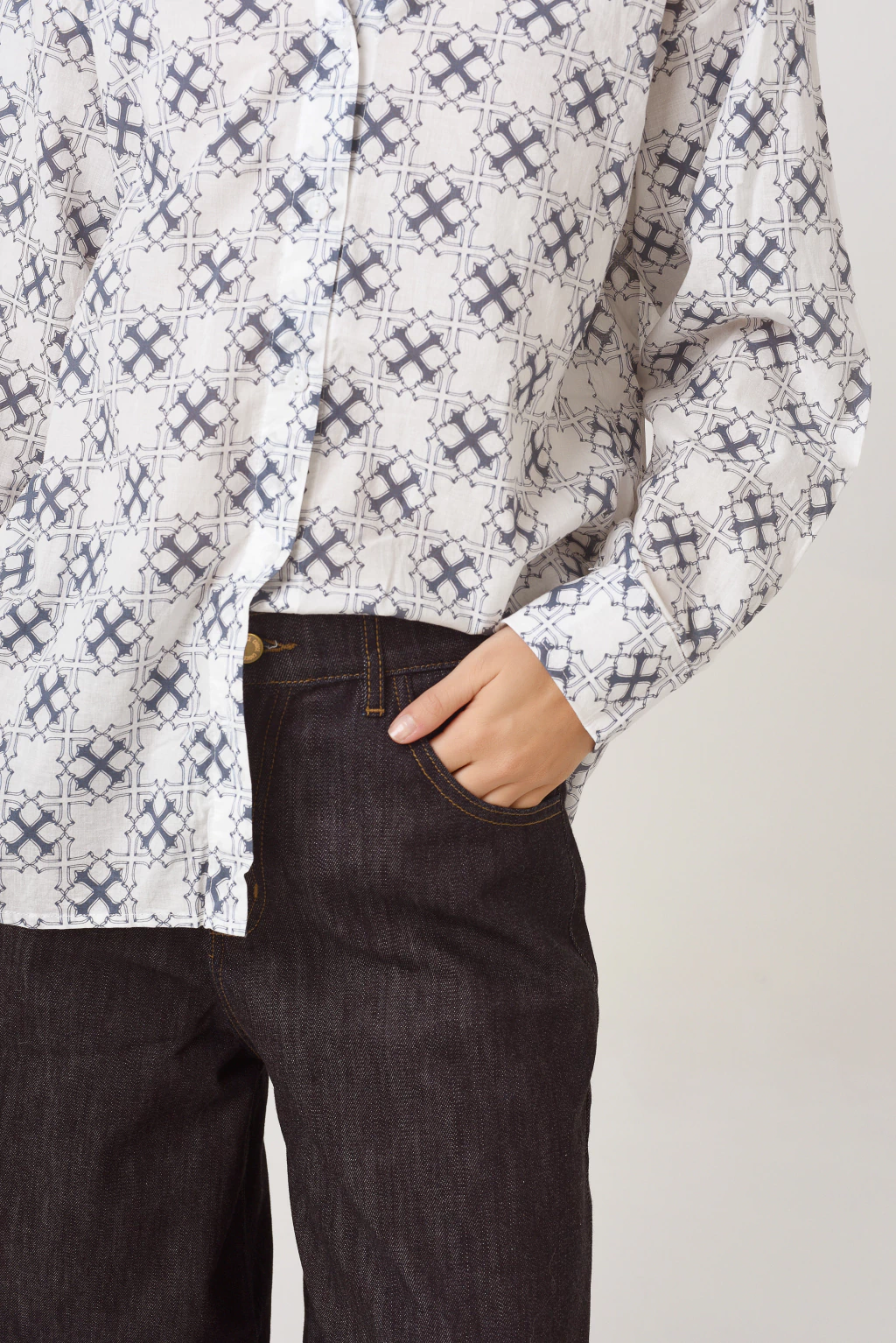 Camisa Maxi Voile corte amplio, hombro caído, tablas en la espalda y recortes en manga.