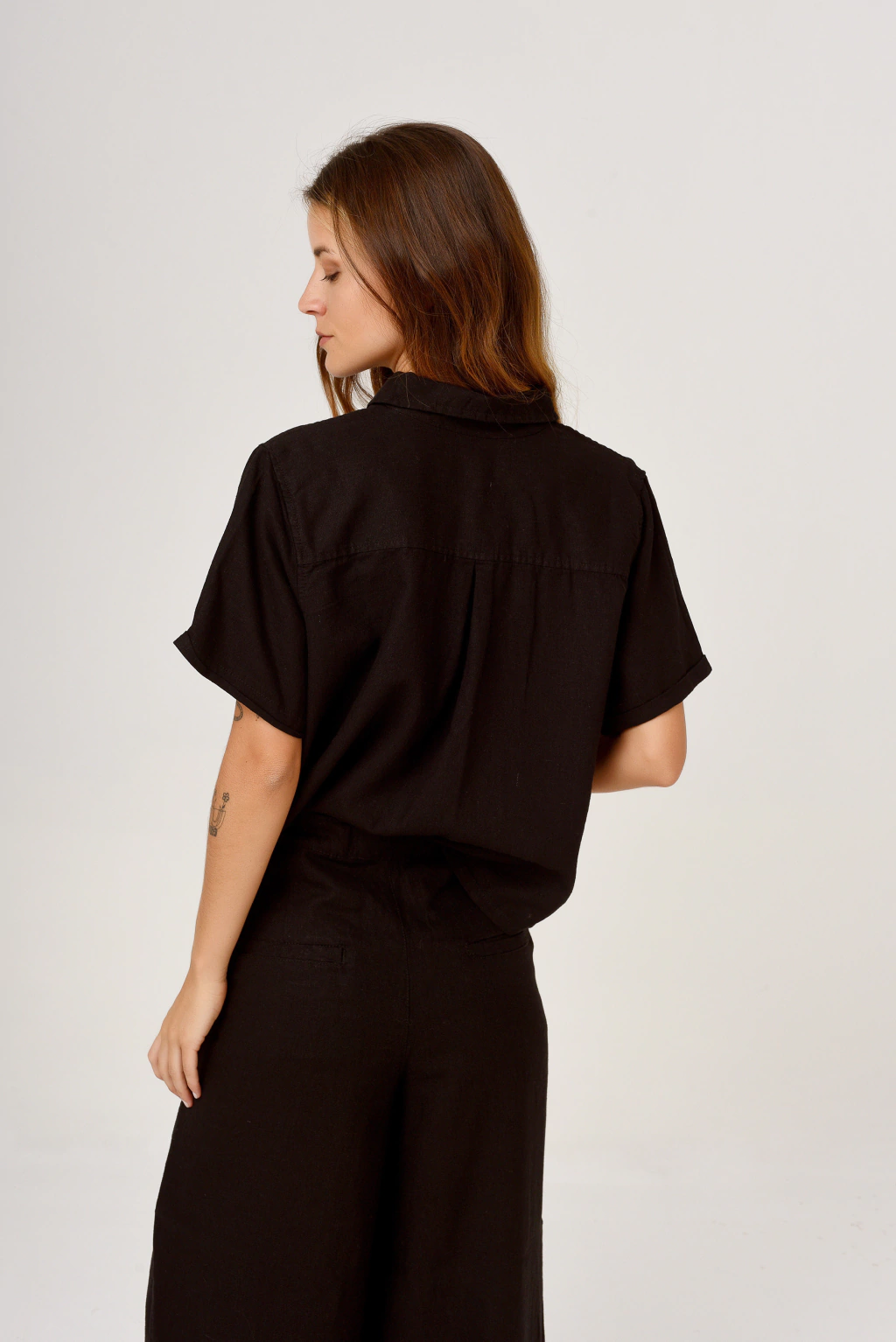 Camisa manga corta en lino rayón prelavado y suavisado, con bolsillos delanteros y doblez en manga