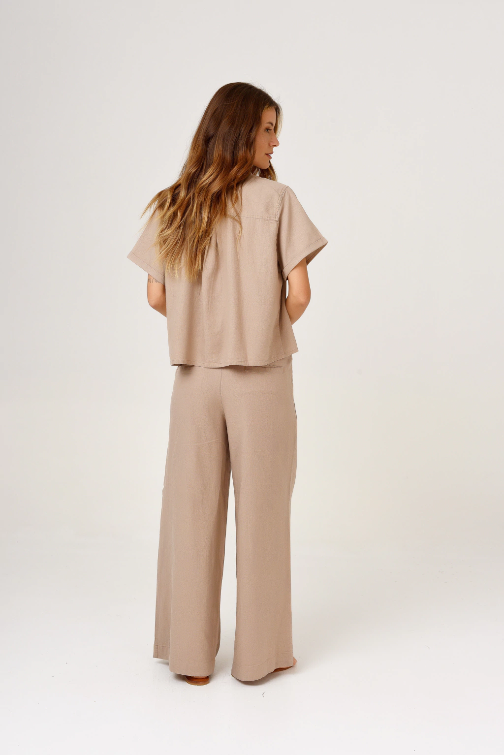 Camisa manga corta en lino rayón prelavado y suavisado, con bolsillos delanteros y doblez en manga