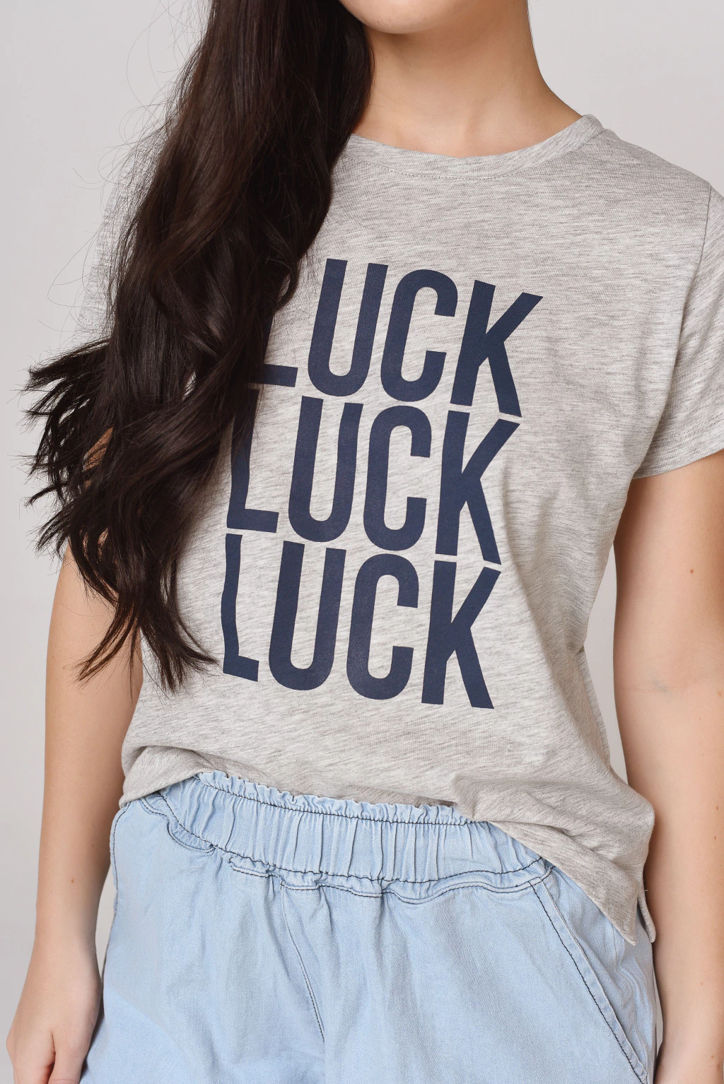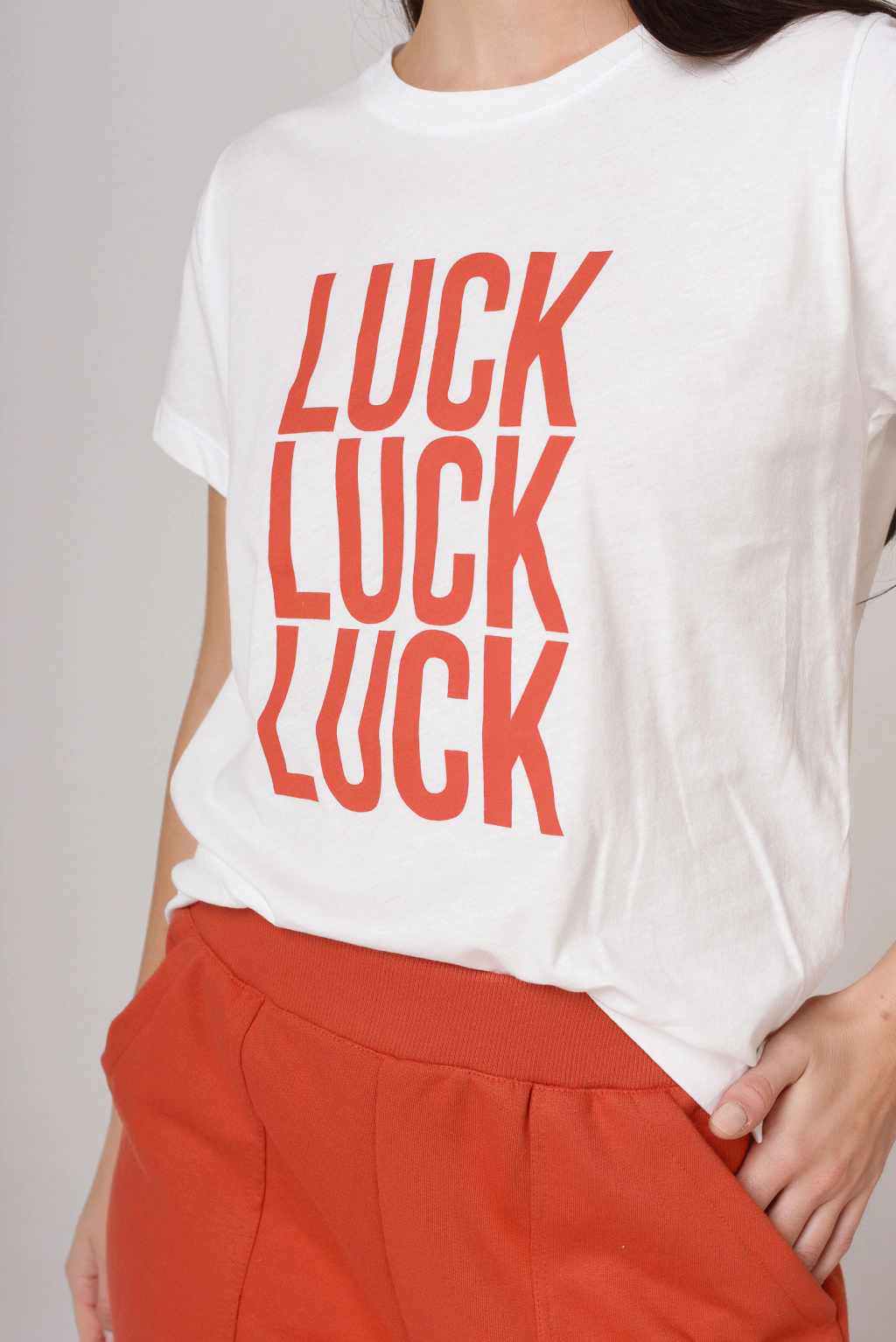 Remera 100% algodón pima, LUCK serigrafiado en delantera, con tintas al agua. Corte recto, ruedo de 4cm y tajos laterales.