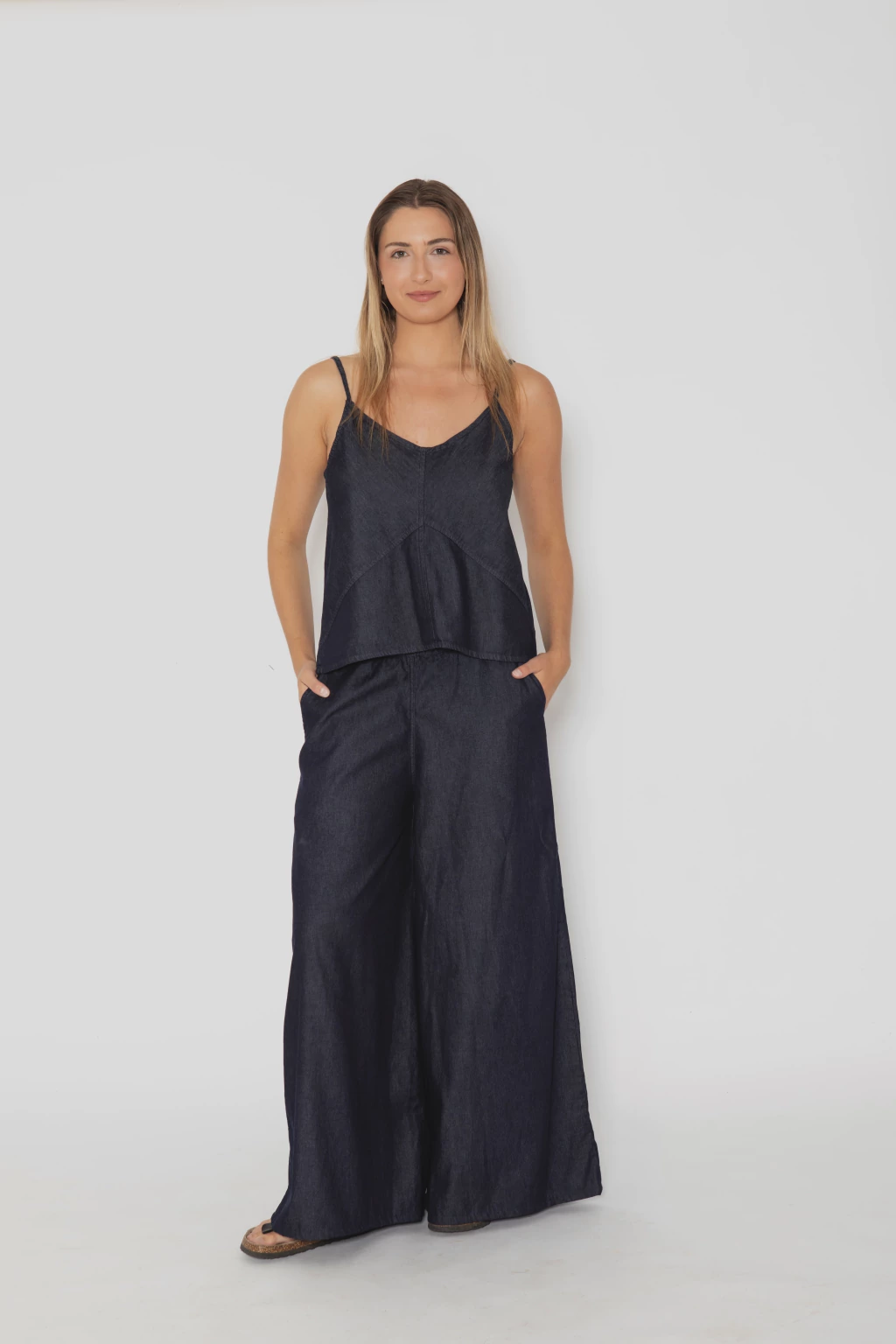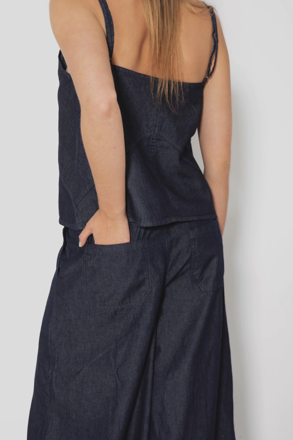 TOP con recortes en frente y espalda con breteles finos regulables. Realizado en Jean liviano.